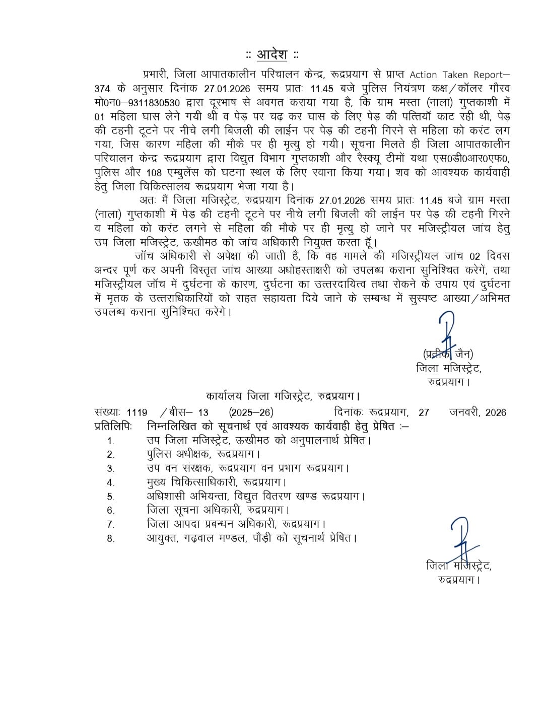 - गुप्तकाशी के ग्राम मस्ता (नाला) में महिला की करंट लगने से हुई मृत्यु पर DM प्रतीक जैन ने मजिस्ट्रियल जांच के दिए आदेश