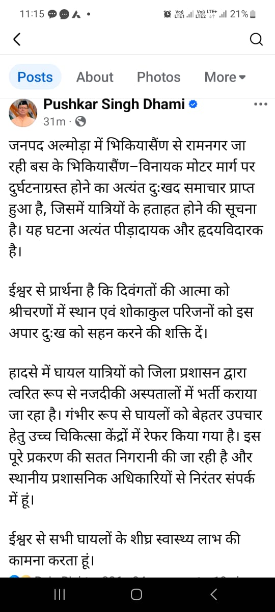 भिकियासैंण–विनायक मार्ग पर हुए भीषण बस हादसे पर मुख्यमंत्री पुष्कर सिंह धामी ने गहरा दुख जताया।