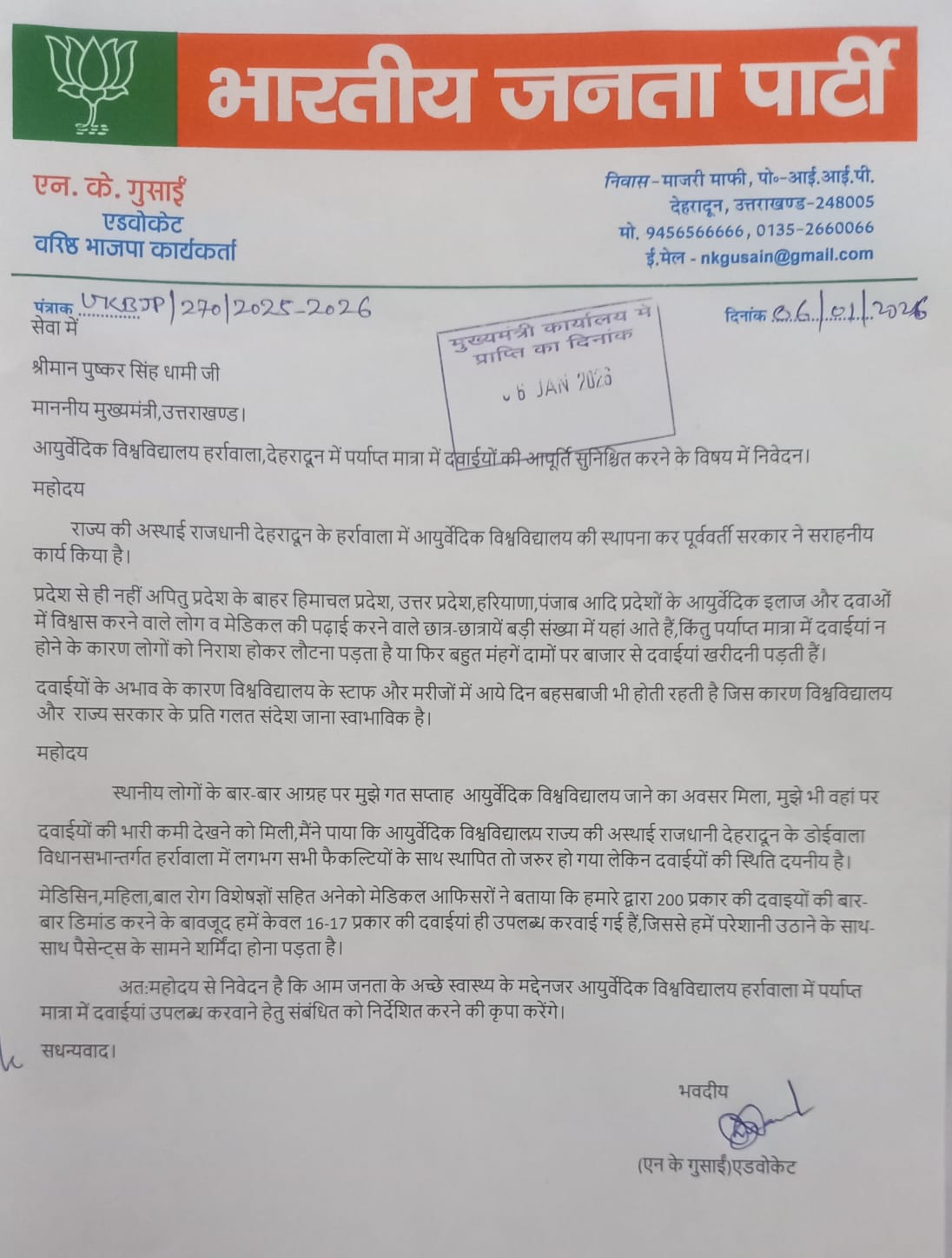 आयुर्वेदिक विश्वविद्यालय हर्रावाला में पर्याप्त मात्रा में दवाईयों की आपूर्ति सुनिश्चित हों, BJP नेता गुसाईं ने CM धामी को लिखा पत्र