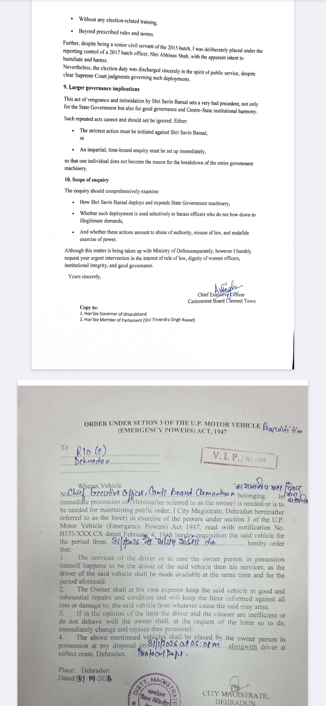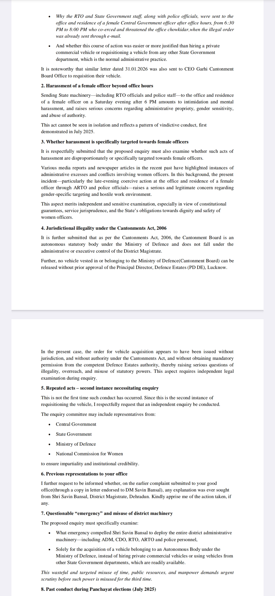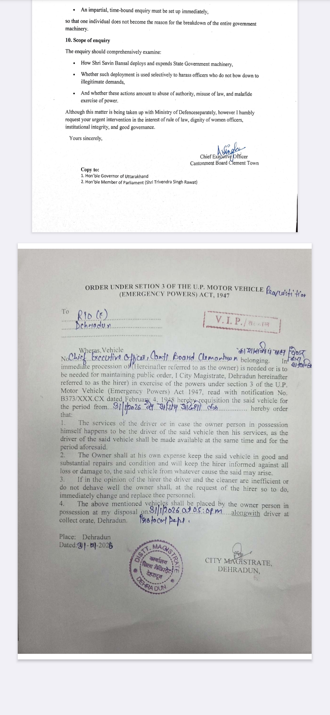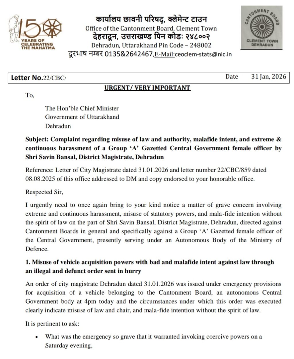 देहरादून, ब्यूरो। यह शिकायत देहरादून के जिलाधिकारी सविन बंसल द्वारा कथित रूप से की गई अधिकारों के दुरुपयोग और उत्पीड़न से संबंधित गंभीर चिंताओं को उजागर करती है, विशेष रूप से केंद्रीय सरकार की ग्रुप ‘ए’ राजपत्रित महिला अधिकारी को लक्षित करते हुए। विशेष रूप से, यह शिकायत आपातकालीन प्रावधानों के तहत कैंटोनमेंट बोर्ड से वाहन के अचानक और संदिग्ध अधिग्रहण से संबंधित है, जो स्पष्ट रूप से बिना किसी वैध आधार के किया गया प्रतीत होता है।