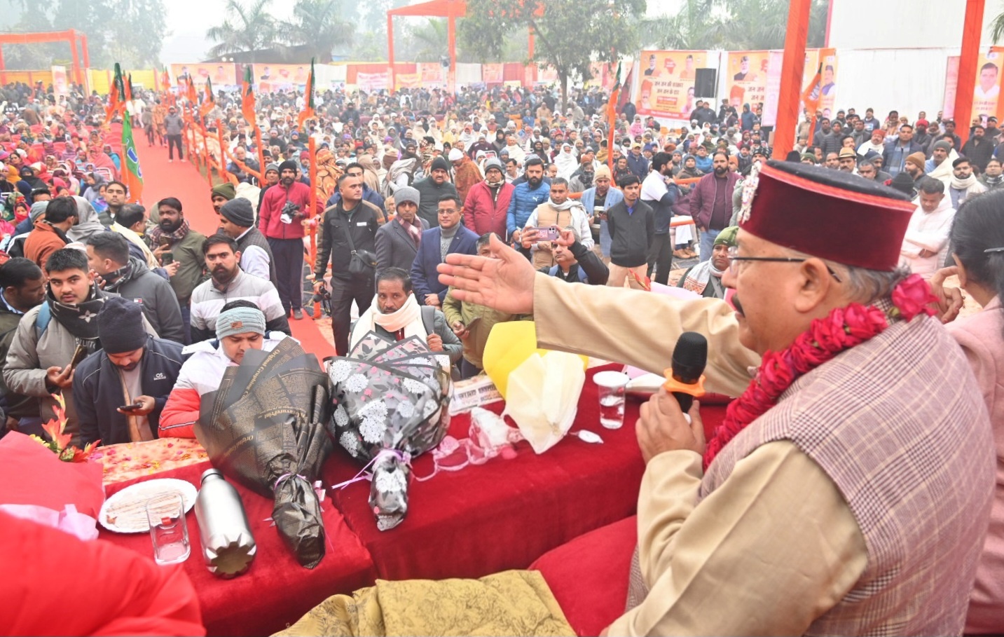 कार्यक्रम को संबोधित करते हुए प्रभारी मंत्री सतपाल महराज ने कहा कि मुख्यमंत्री श्री पुष्कर सिंह धामी जी के कुशल नेतृत्व एवं निर्देशन में प्रदेश में पहली बार सभी न्याय पंचायतों में जन जन की सरकार जन जन के द्वार बहुउद्देशीय शिविर आयोजित किए जा रहे है, जिन में सभी विभागों द्वारा अपने अपने विभागों के स्टॉल के माध्यम से सरकार द्वारा संचालित जनकल्याणकारी योजनाओं का लाभ क्षेत्रवासियों को उपलब्ध कराया जा रहा है। उन्होंने कहा कि आज आयोजित किए गए शिविर में सात हजार से अधिक लोगों ने भाग लिया है तथा लगभग 874 लोगों को संचालित योजनाओं से लाभान्वित किया गया है।