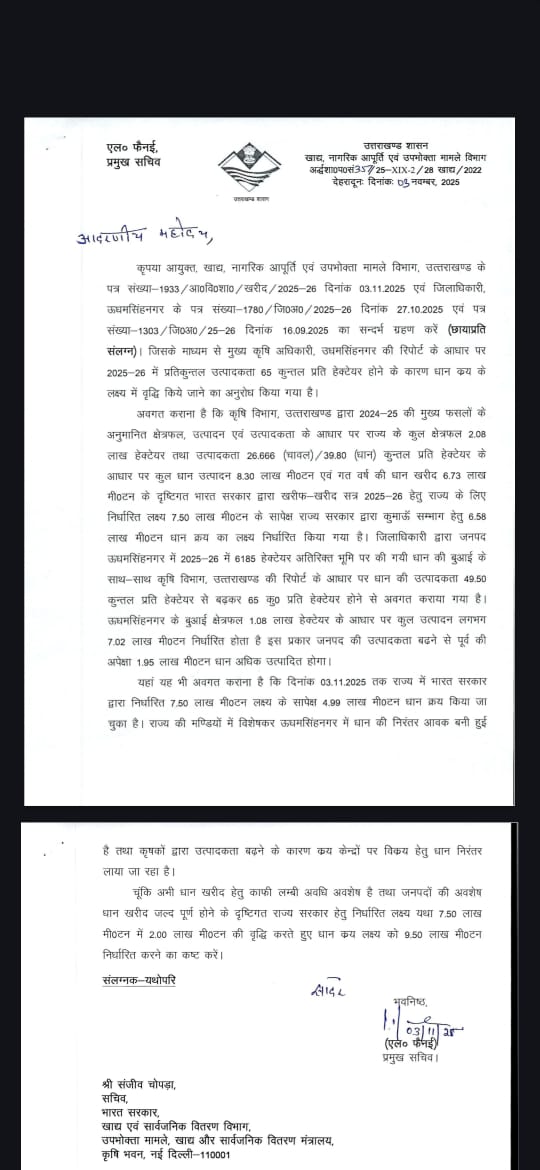 देहरादून, 5 नवंबर, ब्यूरो। उत्तराखंड में इस वर्ष धान की बंपर पैदावार को देखते हुए राज्य सरकार ने केंद्र सरकार को पत्र लिखकर धान खरीद का मौजूदा लक्ष्य 7.50 लाख मीट्रिक टन से और बढ़ाने की मांग की है।